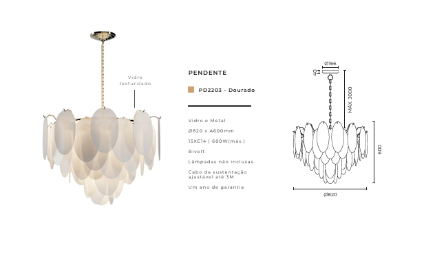 - Material Nobre: Estrutura em metal com acabamento dourado e cúpula formada por 40 placas de Alabastro genuíno.