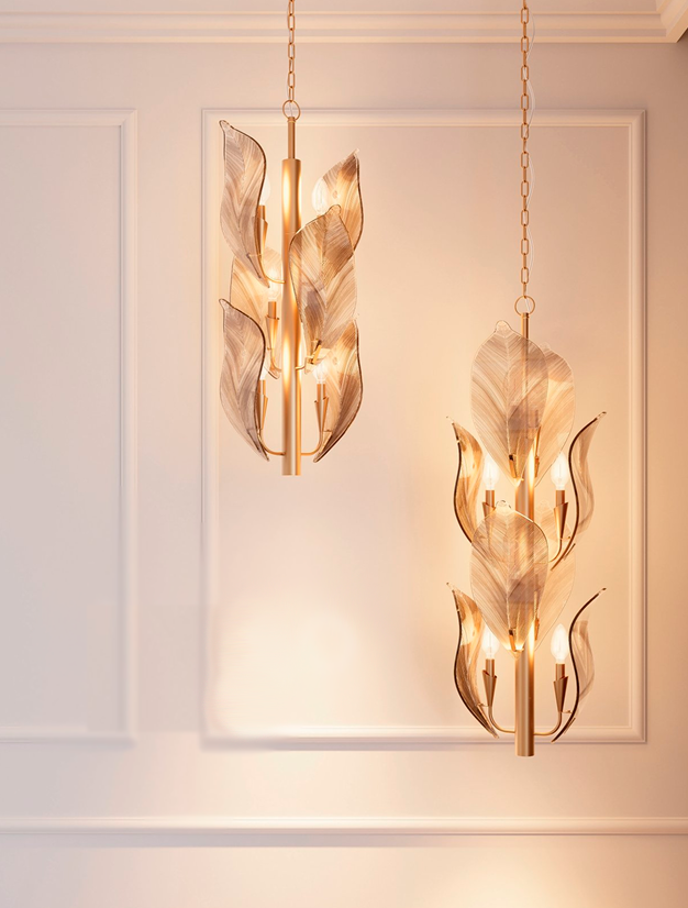 Inspirado na beleza delicada dos cachos e folhagens da natureza, o Pendente Cacho é uma peça de iluminação escultural que combina romance, elegância e uma funcionalidade surpreendente. Sua estrutura vertical em metal com acabamento dourado escovado serve de base para um deslumbrante arranjo de folhas em vidro âmbar, que parecem abraçar a luz.